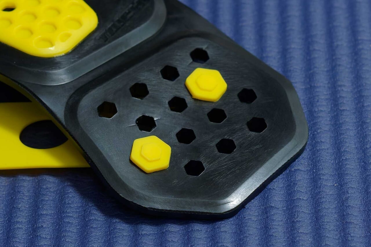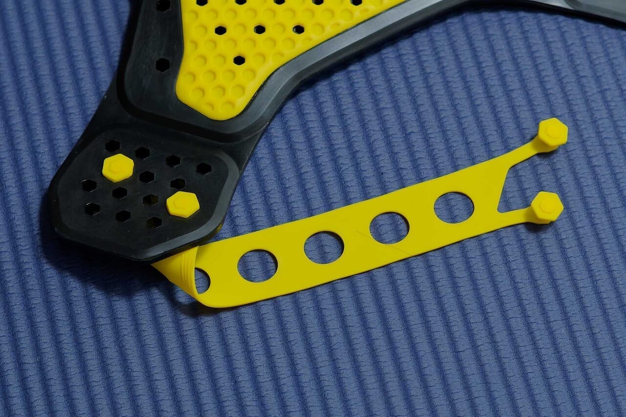 まさにこのシリコンバンド部分です。調整する部分は簡単に抜けないようにかなり硬めに作られています。留め具の構造になっている部分を変形させて穴に押し込むようにして取り付け・取り外しをします。とにかくこの黄色のシリコン部分が硬いのが問題です。何が起こるかというと、レーシングスーツで実際に着用して、この六角の頭部分に圧がかかると肋骨が痛いんですよ……。ちなみに人間の肋骨、正面からはかなり強いですが側面の特定の方向からのダメージでは結構簡単に折れるらしいです。実際に肋骨の側面を場所を少しずつ変えながら押してみるとわかるかもしれませんが、私の場合は簡単に骨が動いて恐怖を感じる場所があります。私の場合はちょうどそこがシリコン部分にあたる装着感です。以上から安心感がなく、あんまり使いたくありません。