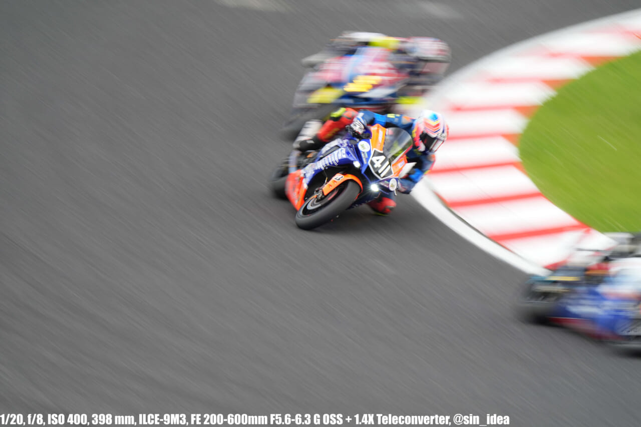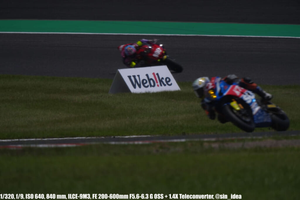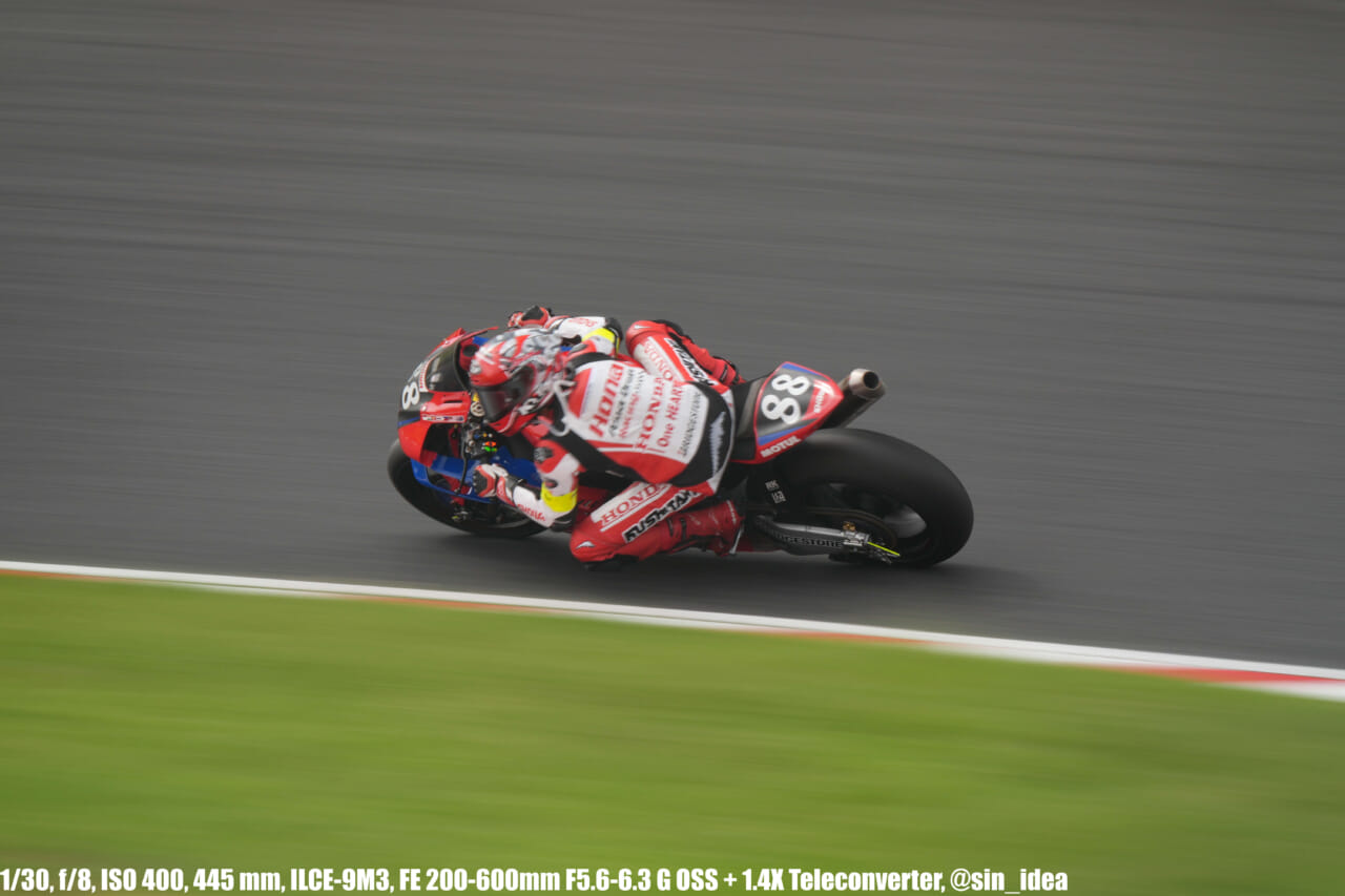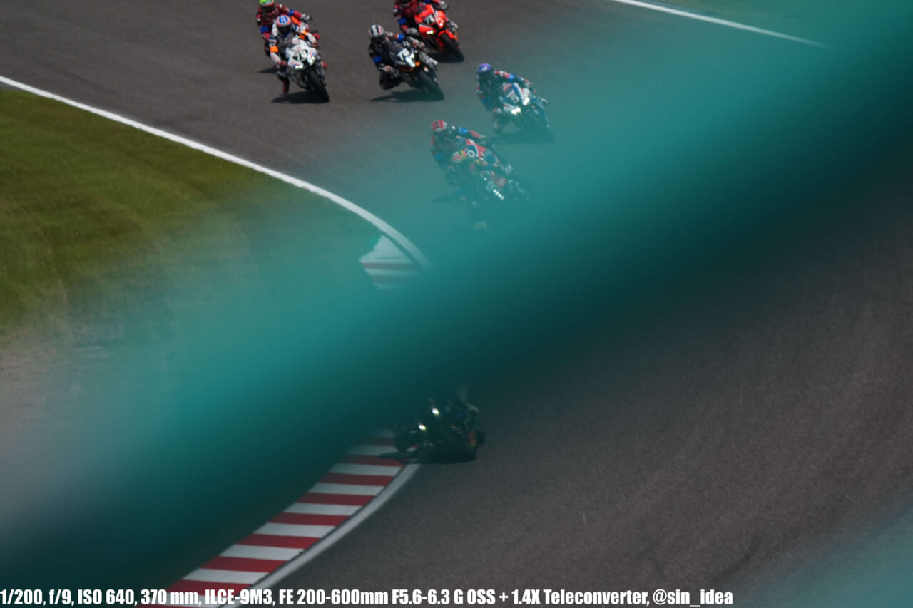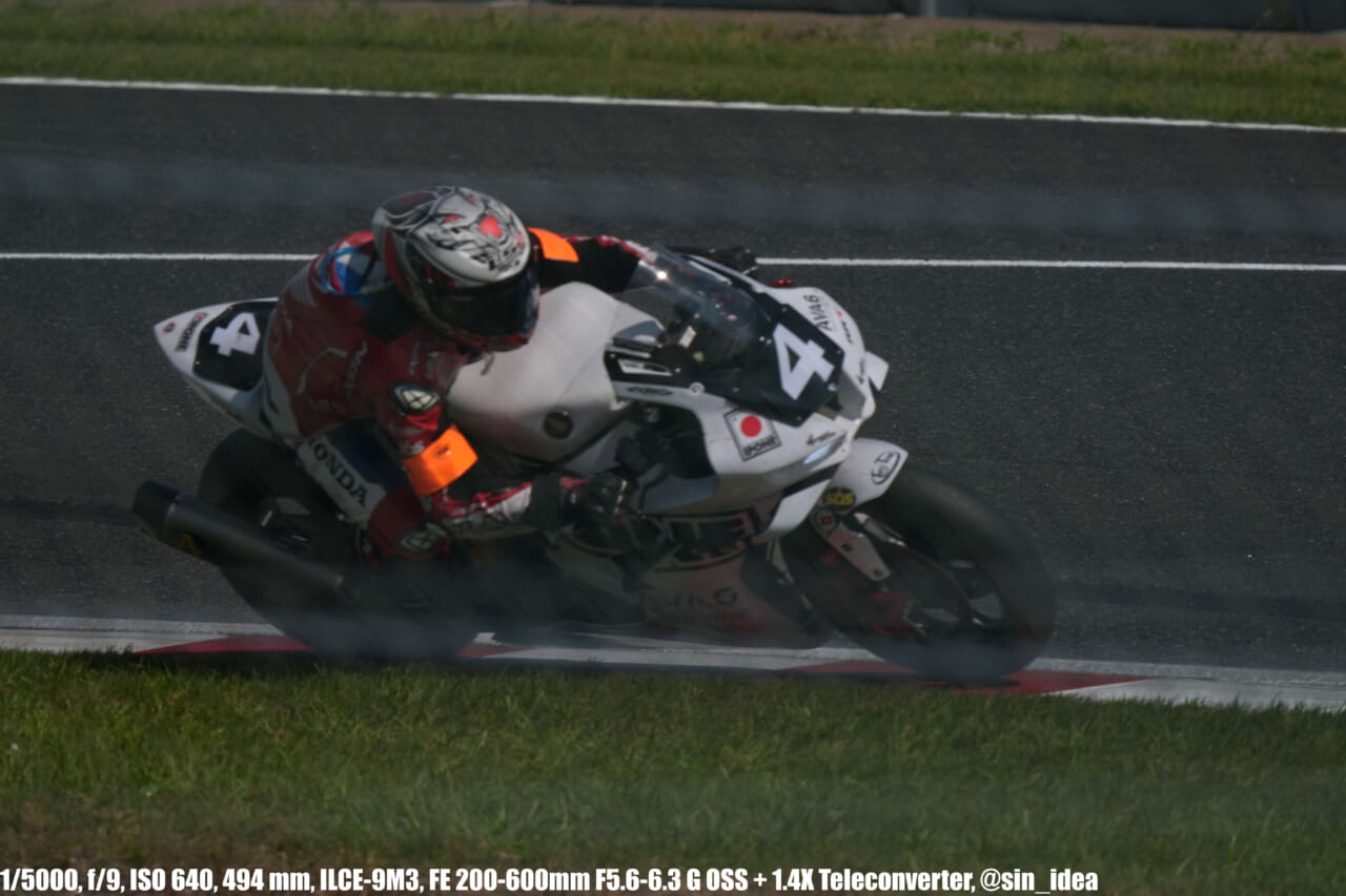 α9iii、さすがに良いですね。TOP10トライアルみたいなときは連射数増やして歩留まりを増やす試みもできますし、二輪シケイン→200R→スプーンの高速コーナーも連写で撮影を試みたりできて、これはこれで楽しいです。普段はマジで10連写くらいで充分なんですけど……。グローバルシャッターの恩恵は感じられませんでした。