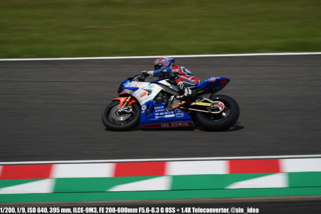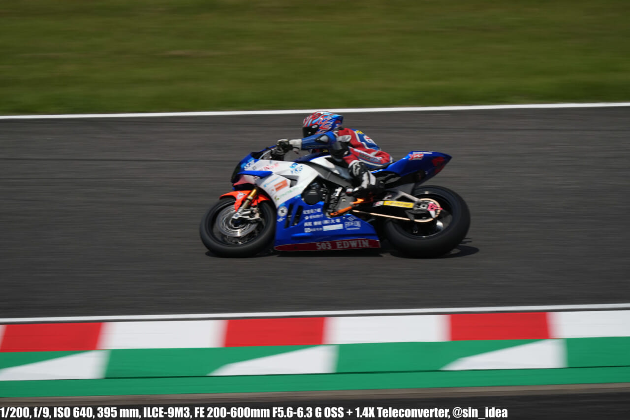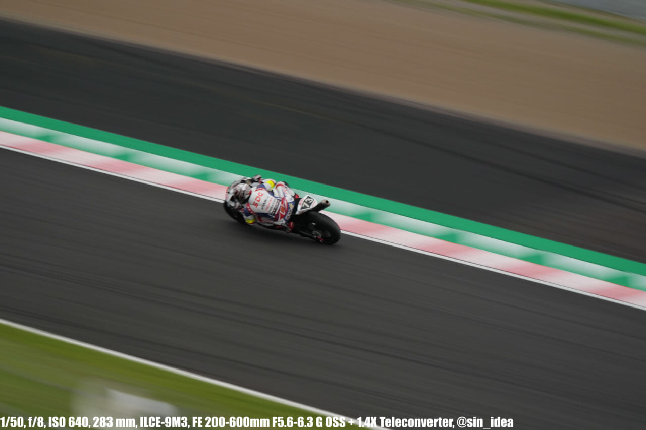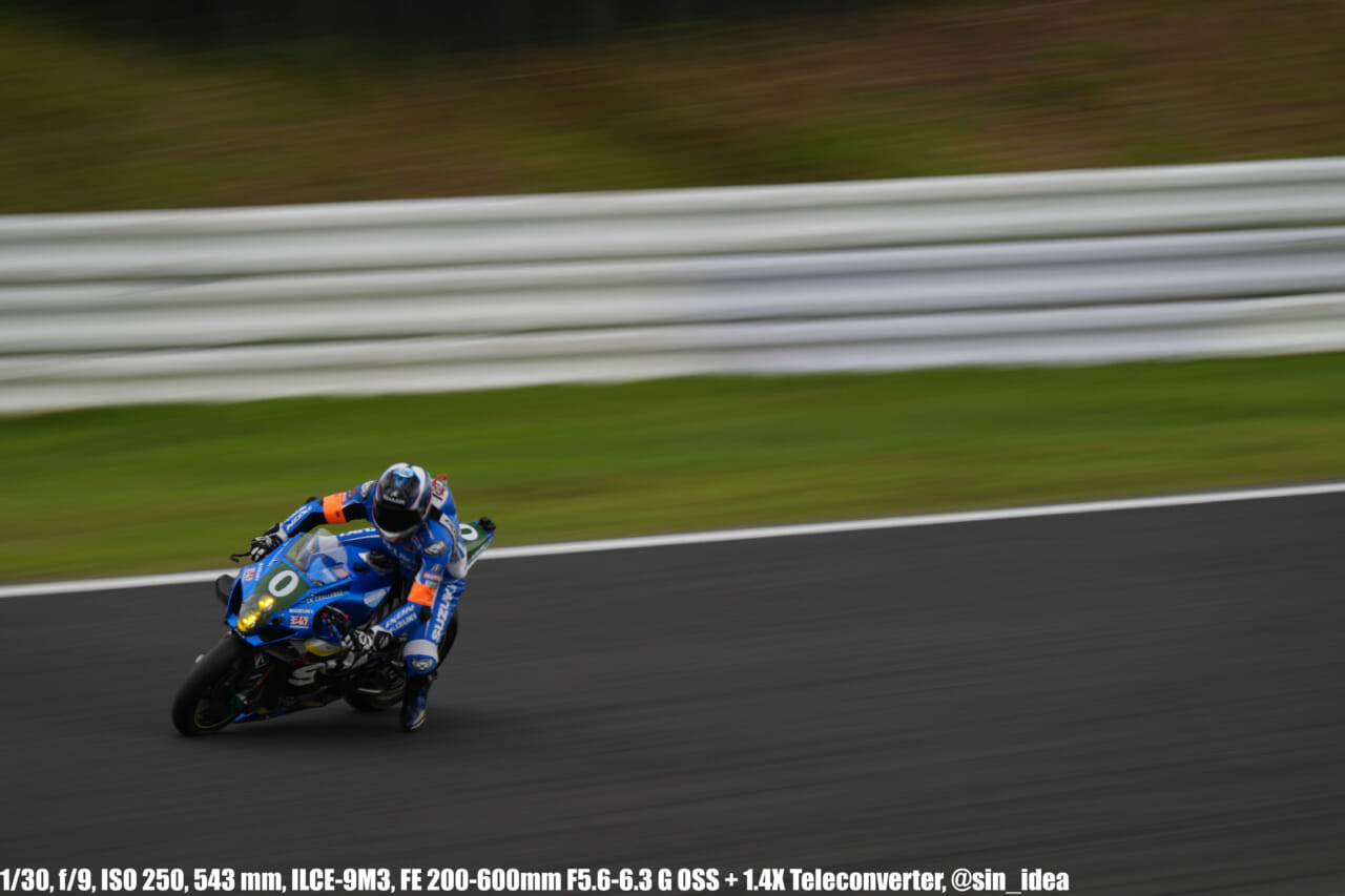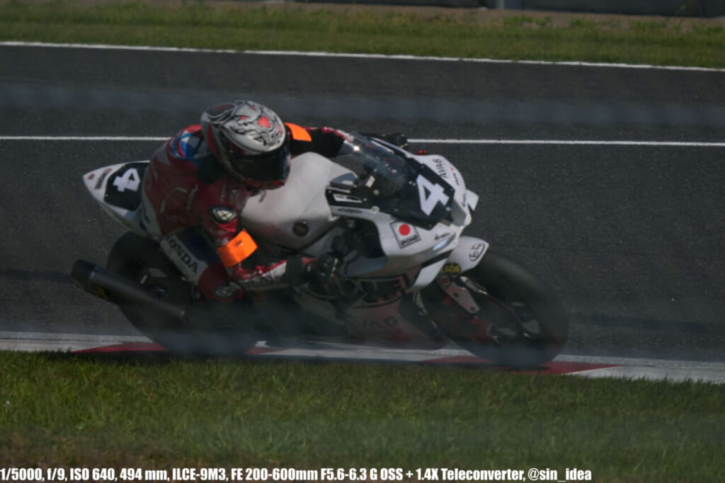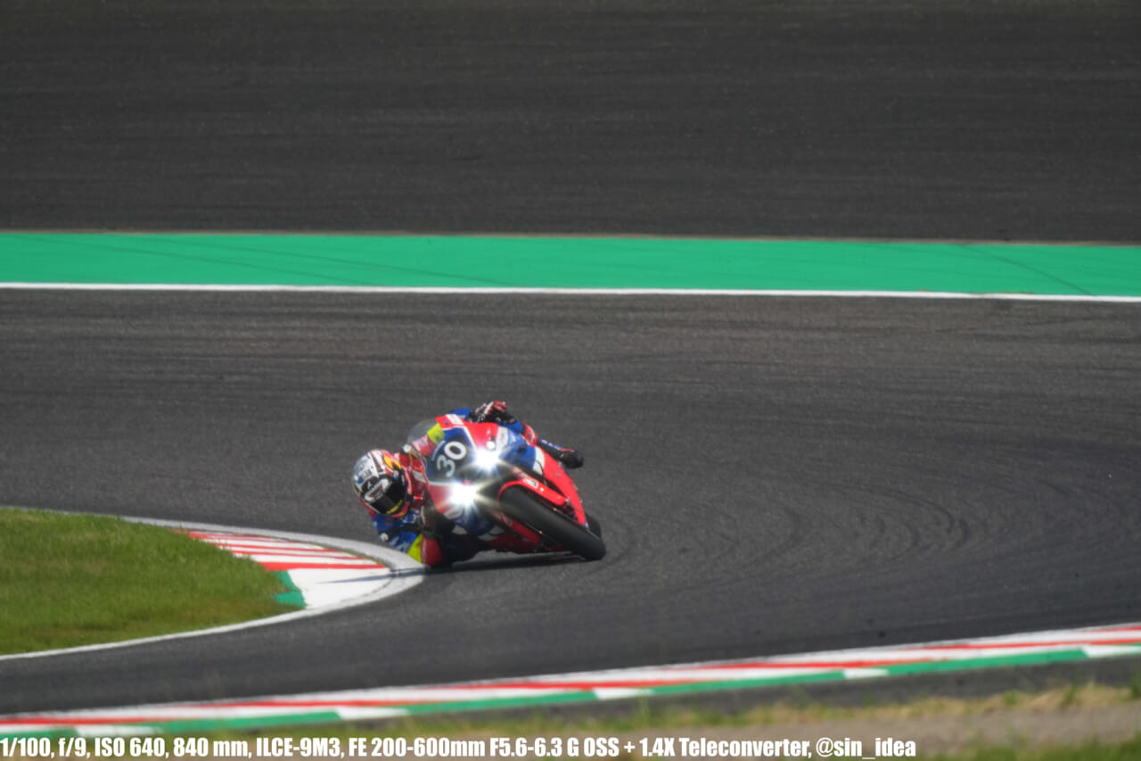 α9iii、さすがに良いですね。TOP10トライアルみたいなときは連射数増やして歩留まりを増やす試みもできますし、二輪シケイン→200R→スプーンの高速コーナーも連写で撮影を試みたりできて、これはこれで楽しいです。普段はマジで10連写くらいで充分なんですけど……。グローバルシャッターの恩恵は感じられませんでした。