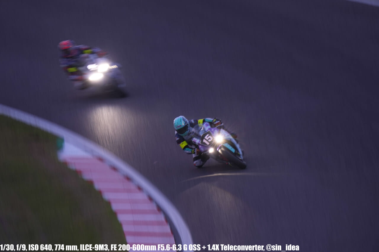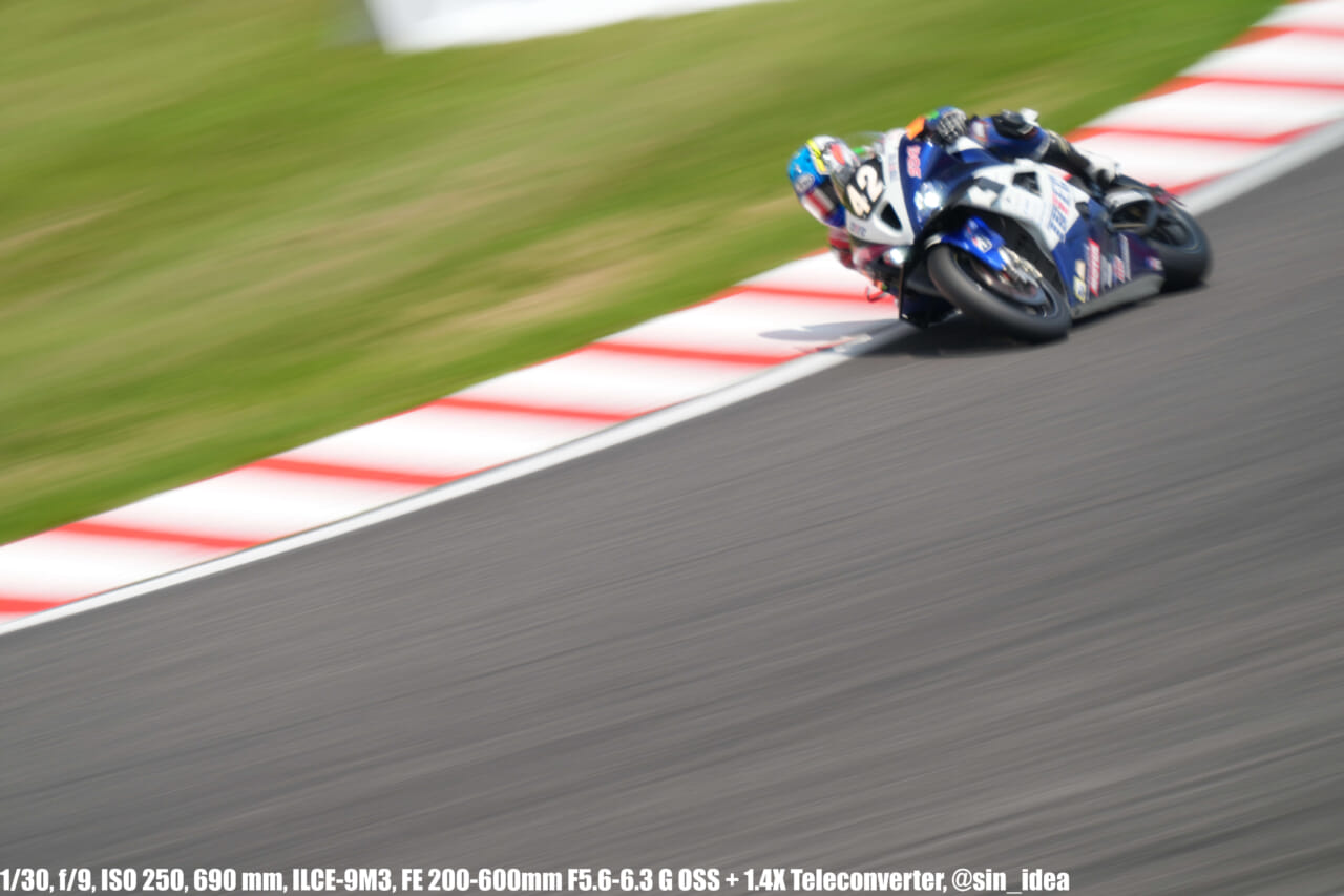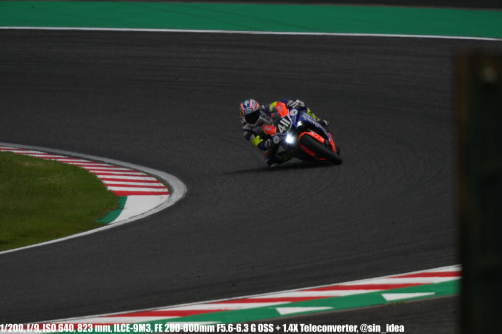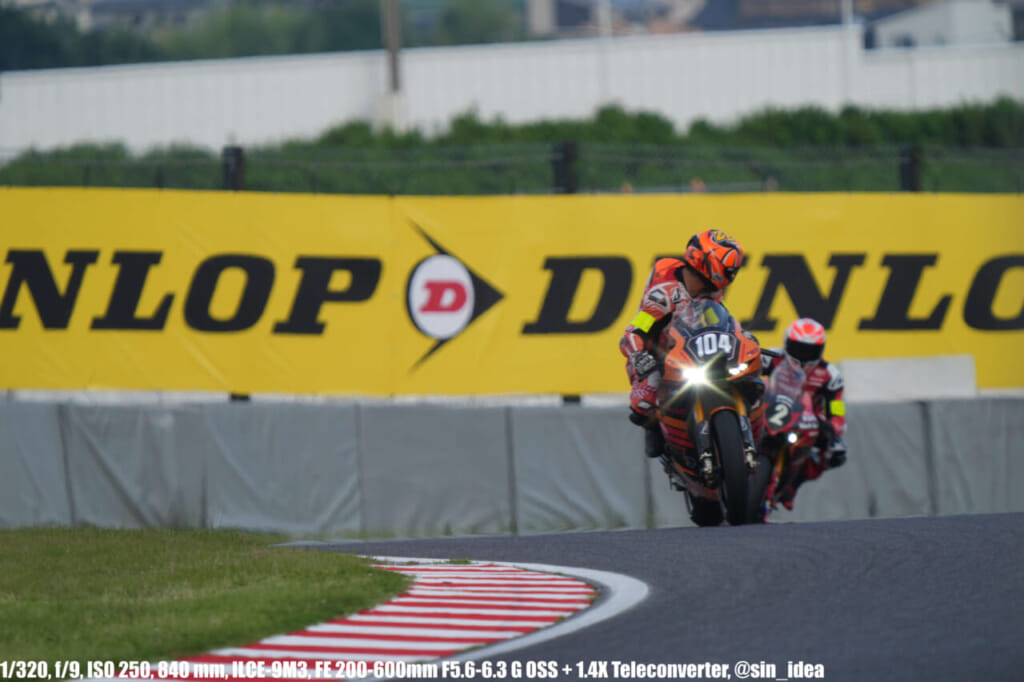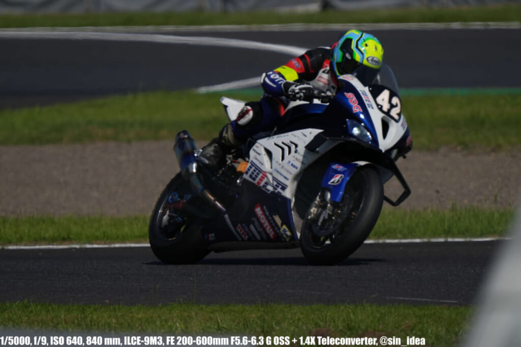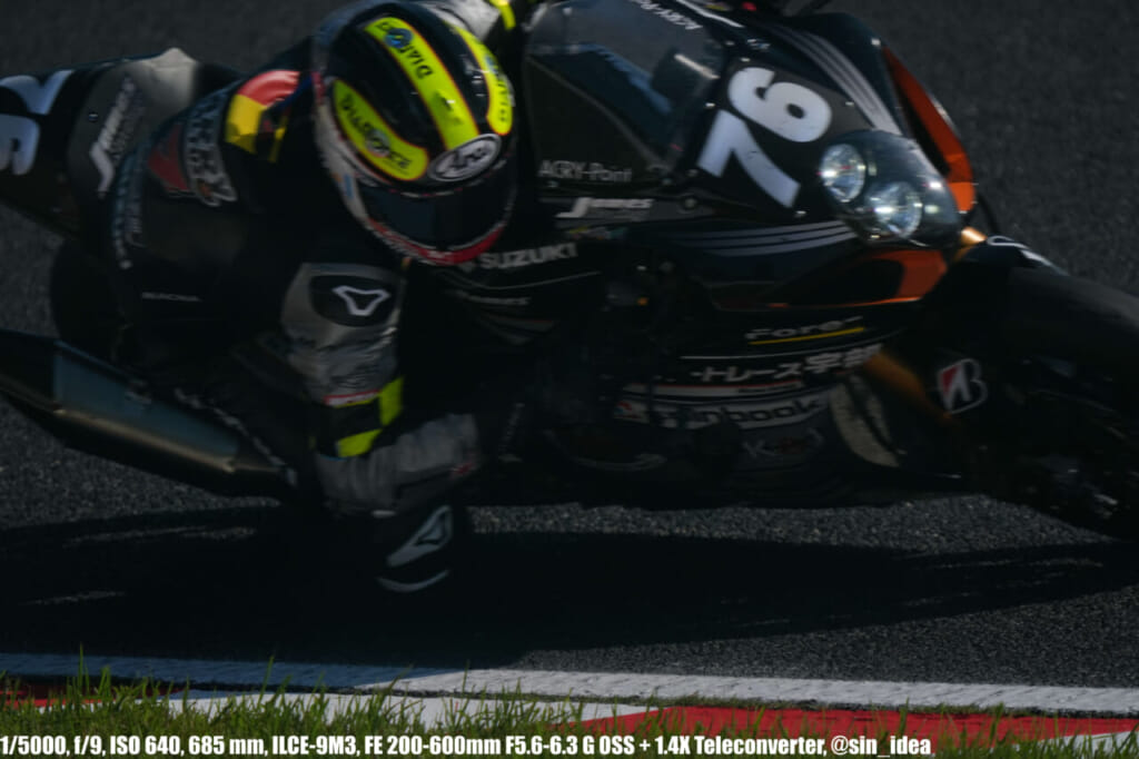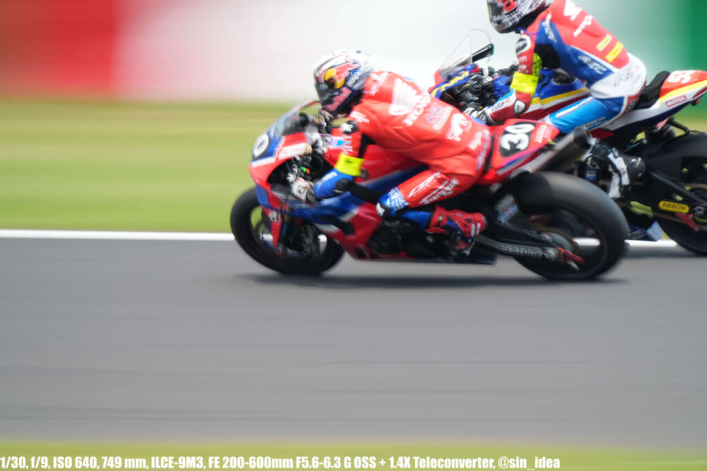 α9iii、さすがに良いですね。TOP10トライアルみたいなときは連射数増やして歩留まりを増やす試みもできますし、二輪シケイン→200R→スプーンの高速コーナーも連写で撮影を試みたりできて、これはこれで楽しいです。普段はマジで10連写くらいで充分なんですけど……。グローバルシャッターの恩恵は感じられませんでした。