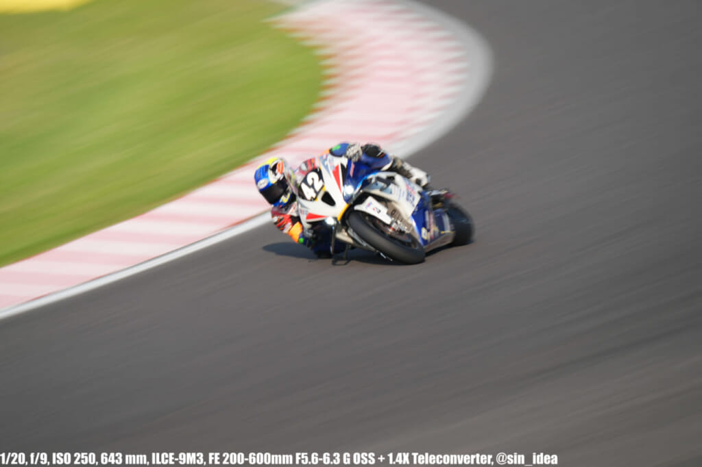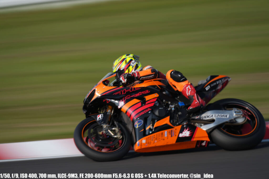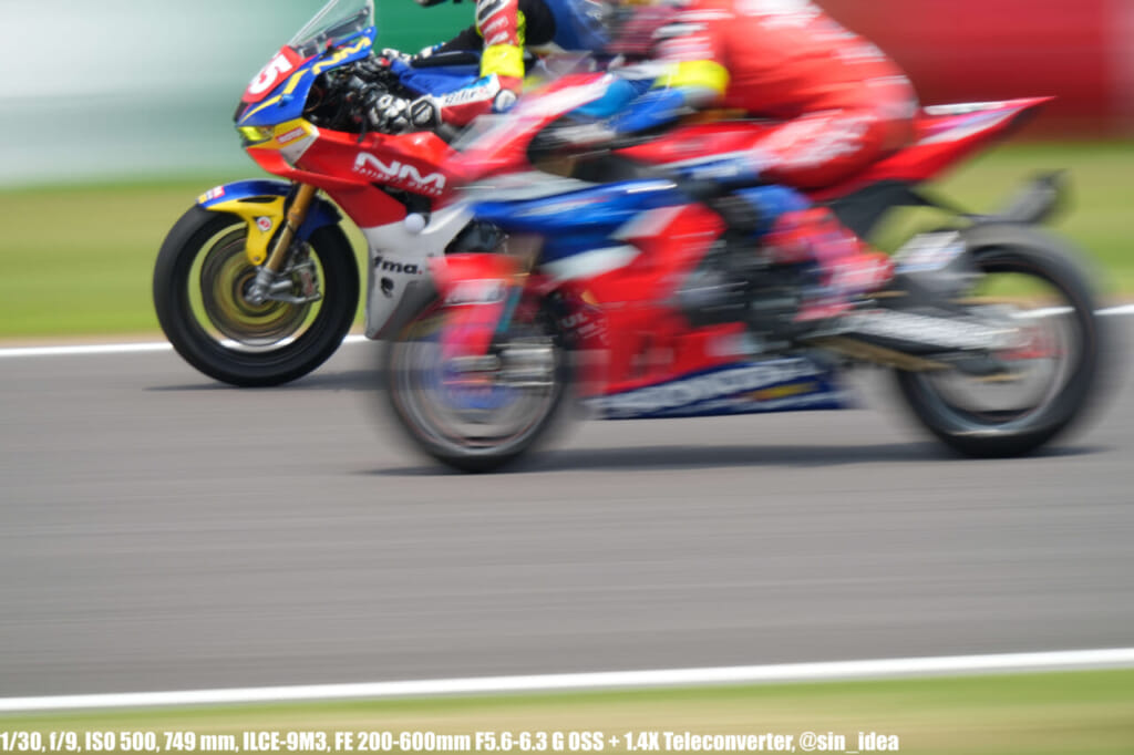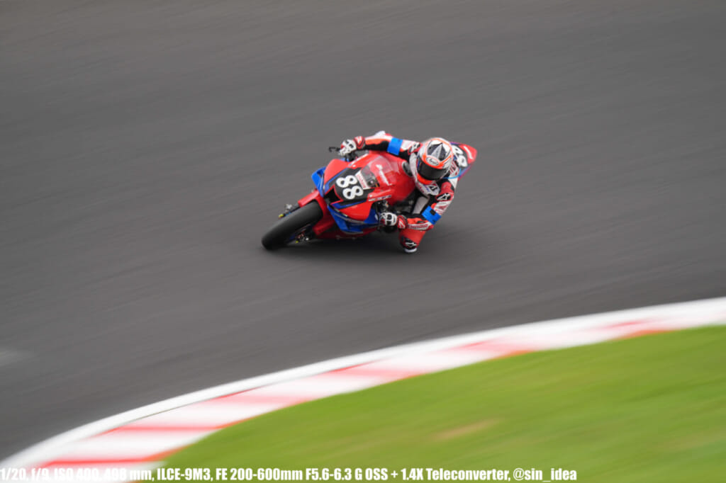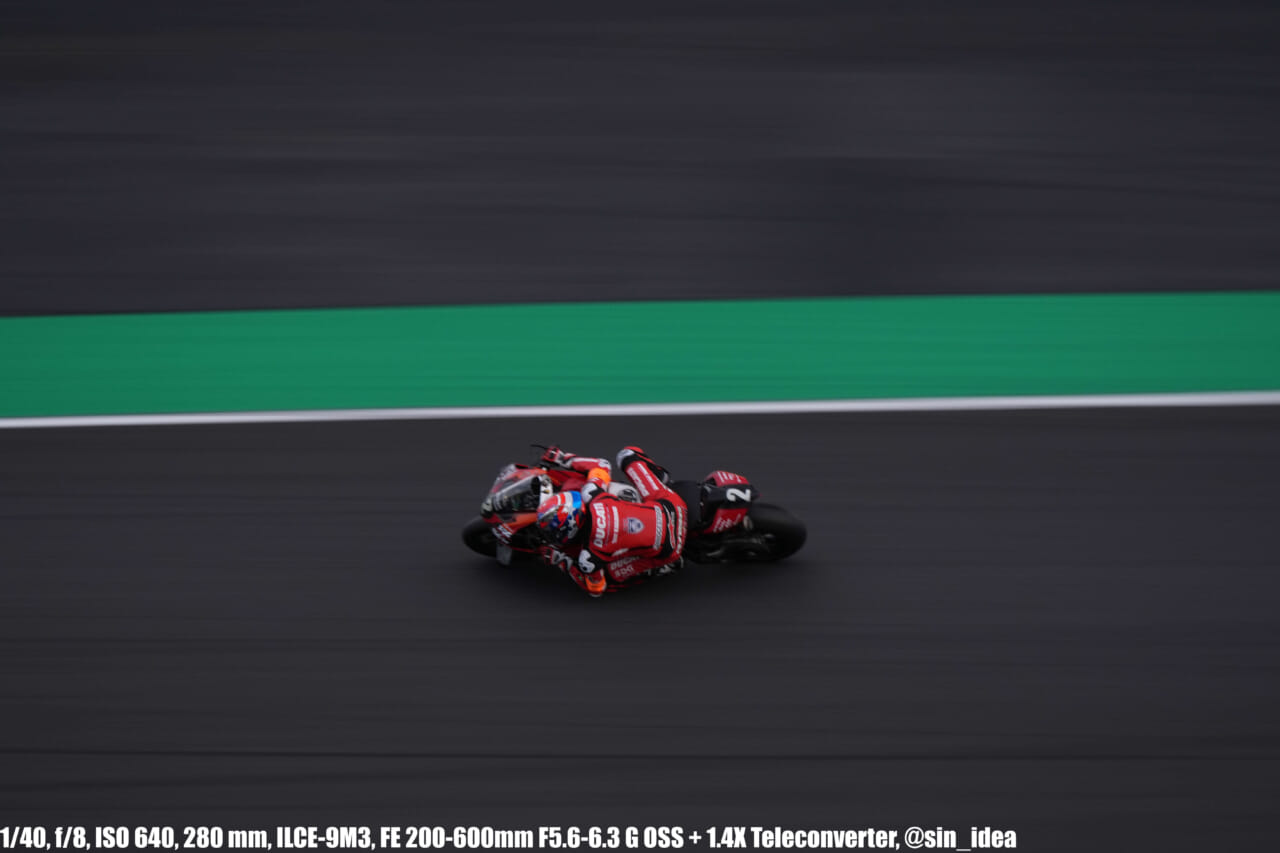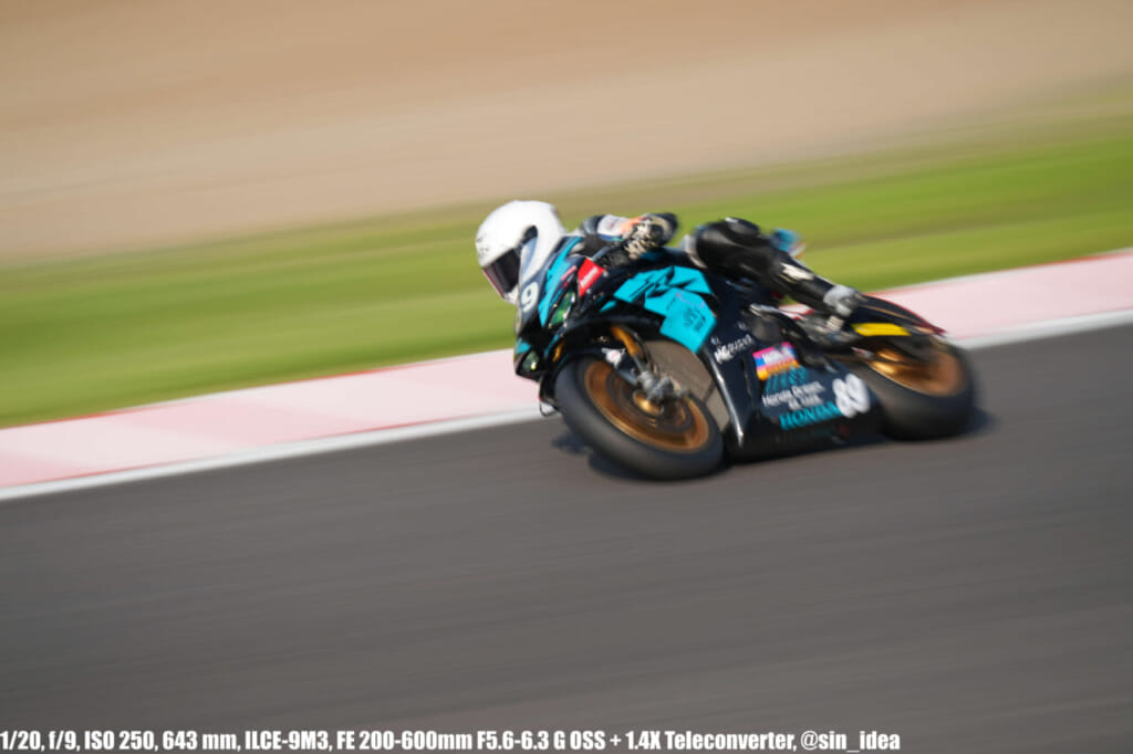 α9iii、さすがに良いですね。TOP10トライアルみたいなときは連射数増やして歩留まりを増やす試みもできますし、二輪シケイン→200R→スプーンの高速コーナーも連写で撮影を試みたりできて、これはこれで楽しいです。普段はマジで10連写くらいで充分なんですけど……。グローバルシャッターの恩恵は感じられませんでした。