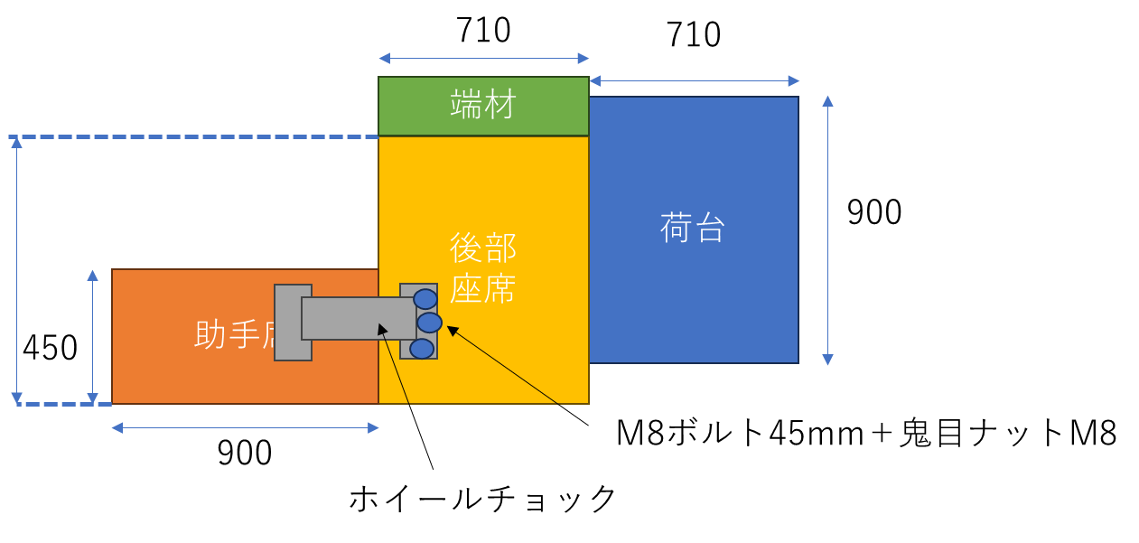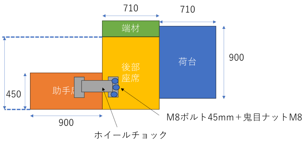 自立しないバイクを乗せるので、先にホイールクランプ(ホイールチョック)を用意しておく必要があります。自作できればかっこいいですが、そういう能力もないので既製品を購入してます。NSR50はWEIMALLのホイールチョックでいけます。汎用っぽいです。サンバーだと、助手席と運転席の間におしこめばホイールチョック自体は機能しますが、N-VANだとホイールチョックも固定する必要があります。N-VANはフックがたくさんあるのでそれを使えば良い気もしますが、今回は敷板に固定することにしました。どう固定しようかと悩んだ結果、鬼目ナットを木に埋め込むことにしました。そのまま裏に通して普通のナットでも良いかなと思いましたが、それやると一定以上の締め込みもできないですし、緩めるときも大変そうなので。普通の鬼目ナットだとまた苦労しそうなので裏からネジ止めするものにしました。このために電動ドリル買ったので割と楽にできました。ホイールチョックに固定用とおぼしき貫通穴が空いていたのでそれを使いました。後ろがM8、前がM10?で留められるはずですが、面倒なので後部だけで固定してます。しかも後ろ穴三箇所空けてますが、加工が下手で2箇所しか入りません。とにかく留めてしまえばチョックごと前にズレてしまうことはありません。事故ったら知らんです。フロントタイヤがN-VAN側のフックの真横に来るくらいの位置にしました。助手席の一番前までバイクを持っていくと普通に側方の視界が悪くなるのと、事故ったときにバイクのハンドルやレバーが運転手に突き刺さってしまいます。乗せる車両が長くなったら、もう少し前の方にずらして、前側の板に穴を開けようかなと思ってます。固定のイメージは現状こんな感じです。ホイールチョックの位置決めは実際にバイクを乗せてやりましょう。特にスライドドアを締めたときにレバーやハンドルが当たらないことを確認しましょう。ただし、下図の板の寸法だと少し板が動きます。ギチギチにしたいなら専用品買いましょう。