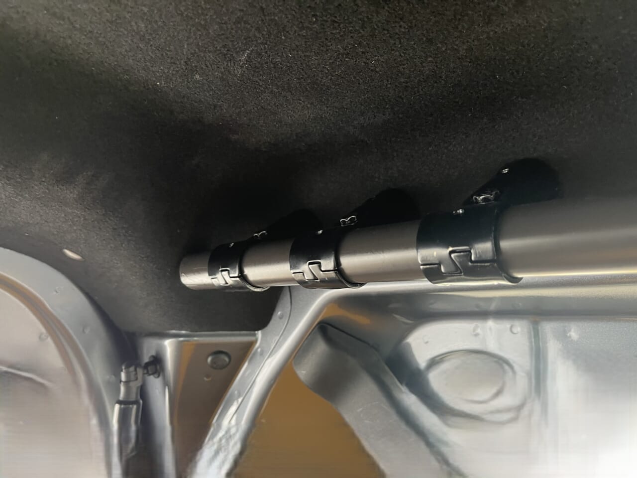 後部はユーティリティナットがあるので、イレクターパイプの互換品(近所のホームセンターにはイレクターパイプ自体はなかった)を取り付けました。ツナギとかぶら下げられるものひっかけるくらいですね。バイクを載せるラダーを立てかけたい気もするのですが、板を留めておかないと窓ガラス割れそうなので保留です。アタッチメントは強度が必要そうなところには中実になっている正規品を、強度いらなそうなところはイレクターパイプ自体を適切な長さにカットして代用品を作成しました(参考URL3つ目)