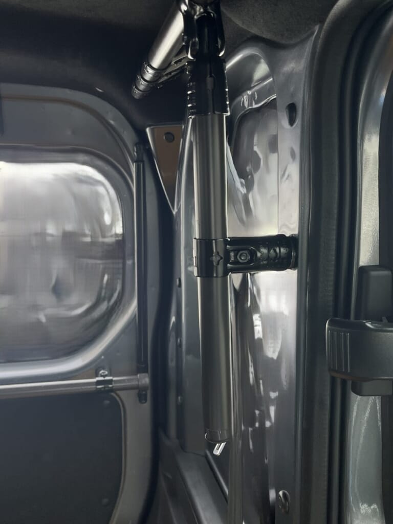 リアゲートもツナギぶら下げても平気で、サーキットだと一気にそれっぽくなります。N-VAN側のネジ山にかなり負担かかってるとは思いますが、まぁ自分の車なので好きにやります。