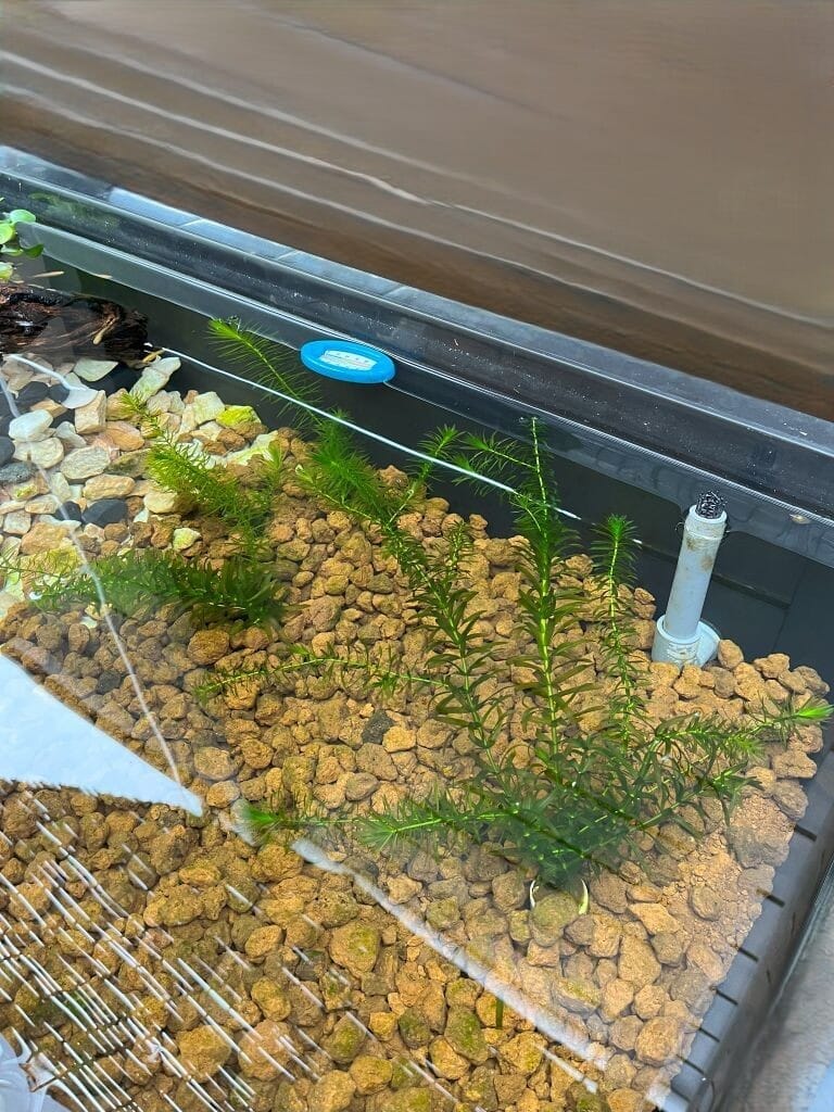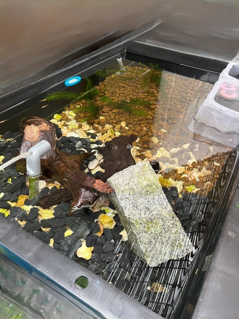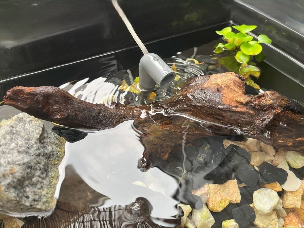 動画をよく見ていなかったので悪いのですが、カゴとろ過装置は壁に寄せたほうがよさそうです。吹き出し口のない側の水が若干淀みます。先程メダカを避難させたうえでレイアウトを無理やり変更してきましたが、マジで大変でした。足腰が痛い。また、作業で濁りが出てしまいました。退避も慎重にやらないといけなかったのですが、少し失敗した気もします。とにかく生体に負担がかかってそうです。あと、砂利の量が足りないのかどうしてもカゴのスキマができてしまいました。今度砂利を追加しようと思います。1匹白っぽくなってたメダカがいたのでもうだめかも……となっています(メダカ、☆になると水底で真っ白になっていることが多いです)