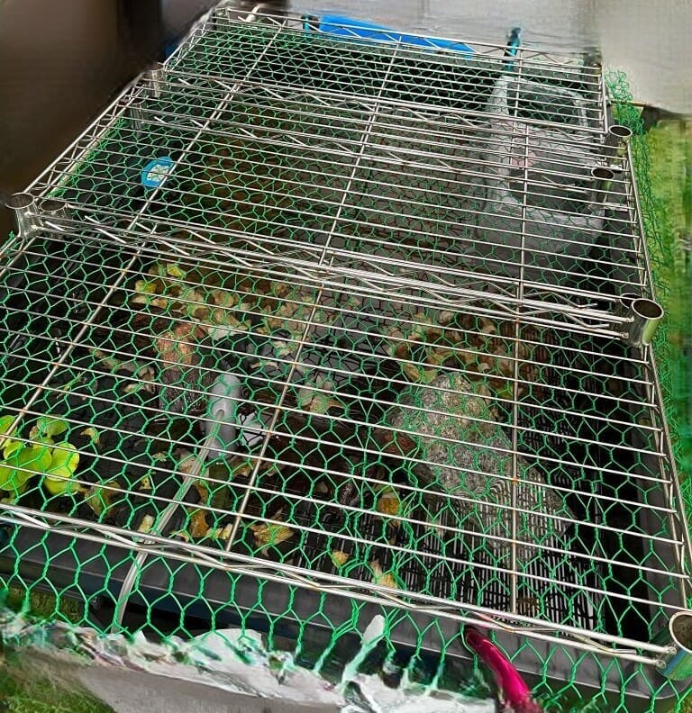 田舎というほど田舎ではないのですが、どうも近所に猫かなにかがいるようで、庭に入り込んでいる様子が以前から監視カメラに映っていました。メダカなんて格好の餌なので、確実に防御する必要があります。金属タイプのネットを切り売りのもので買って、上からかけることにしました。ナイロン製の動物避けのネットをきちんとテンションかけて張るでも良い気もするのですが、試行錯誤中です。そして更にその上にスチールラックの棚板を乗せてます。ネットだけだと上から押すとどうしても凹んでしまうので、このようにしています。もうちょいマシな蓋がないかなと思っています。固定はタイラップかカラビナにしてます。ちなみに固定用カラビナのサイズ選定を間違えて、3000円くらい無駄金使ってます。大きいので良いですね。