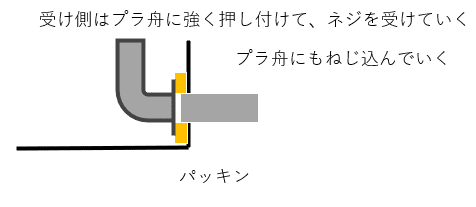ここで気をつけないといけないのは、受け側のパイプをパッキンごと強く押し付けた状態でねじ山を噛ませないと、プラ舟にもネジ山がかかってるのでスキマができてしまいます。もちろん受け側を締め込めば済む、のですが穴あけ位置を底面によせるとエルボ受け側のまわり代がありません。詰みます。