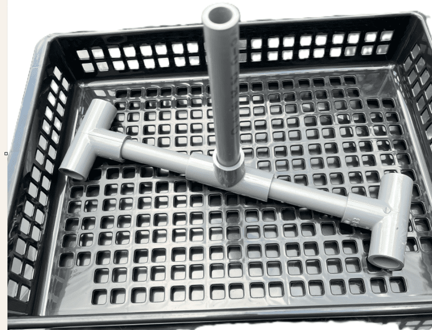 最後エアチューブを通すためにエルボに穴を開けますが、穴径が意外と大きく取らないといけませんでした。塩ビ相手ならなんでもいいのでセットドリルがあると便利です。カゴ部分もハサミで穴あけすれば十分でした。万能ハサミが一本あると気楽ですね。こんな感じです。先端のエルボはどちらでも良いのですが、エルボをつけると高さが出て水が吹き出しにくくなるのでストレート部分を短くしたほうが良いです。あと、穴は真上から開ける形にしたほうがチューブ入れやすくなりますね。