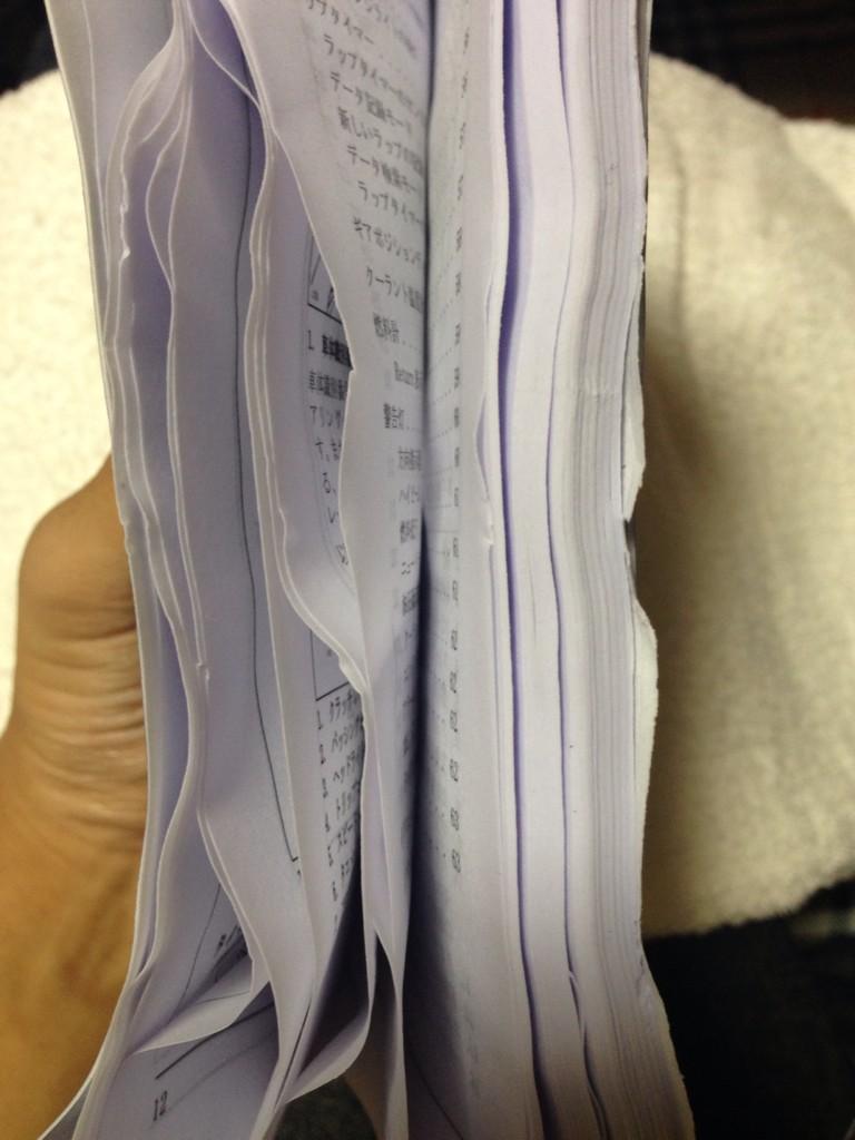 もう見事な水没でした。左がデロデロなのは一枚一枚剥がしたからなんですけど完全に逆効果ですね。何ページか開けてティッシュ挟んだりしましたがもう色々無駄でした。というか後半のほう開いた拍子にページの根本から破けてますもん。