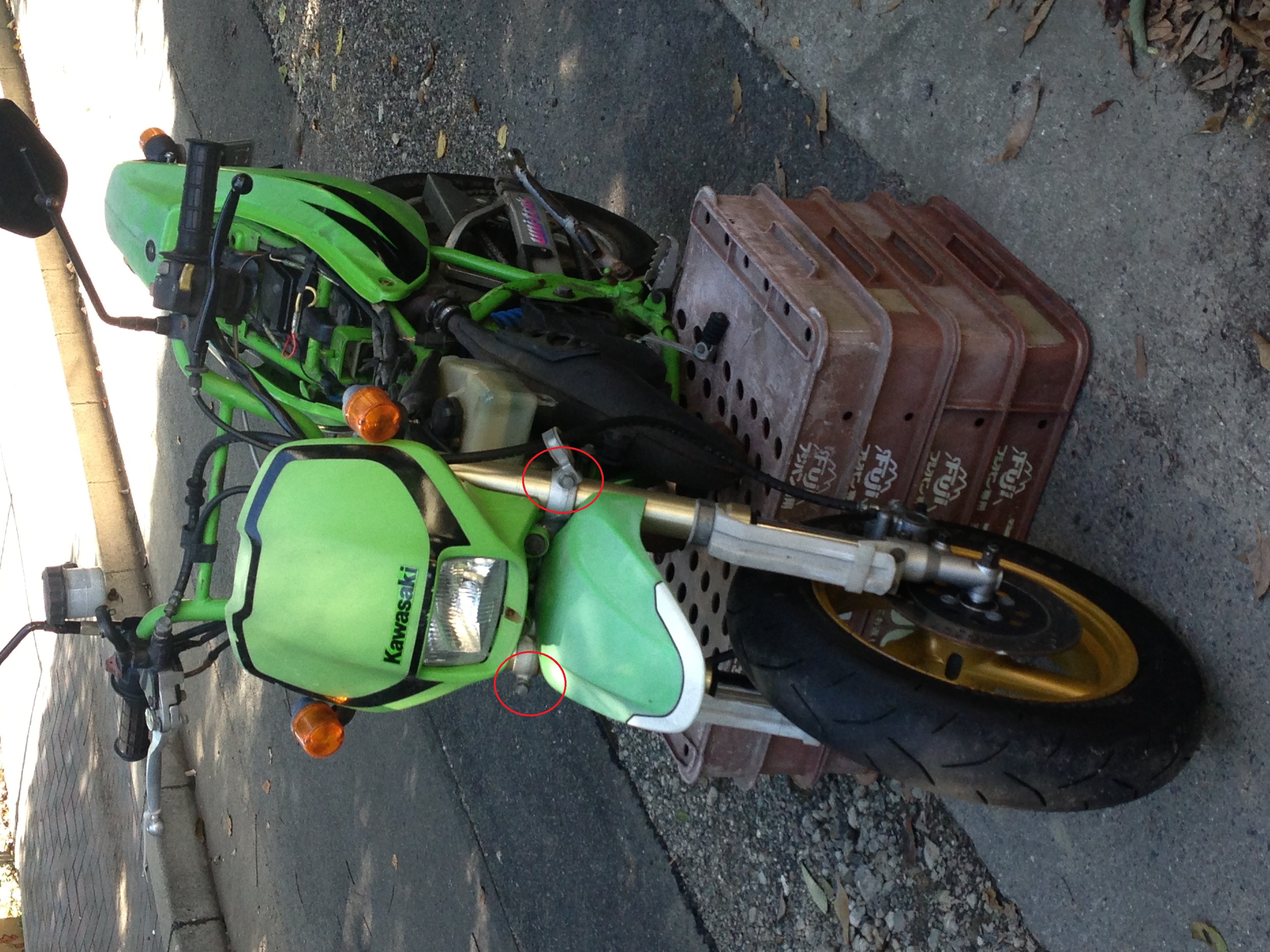 赤丸打ったんですが全然わかんないですね。フロントフォークの下側のボルトに注目してください。