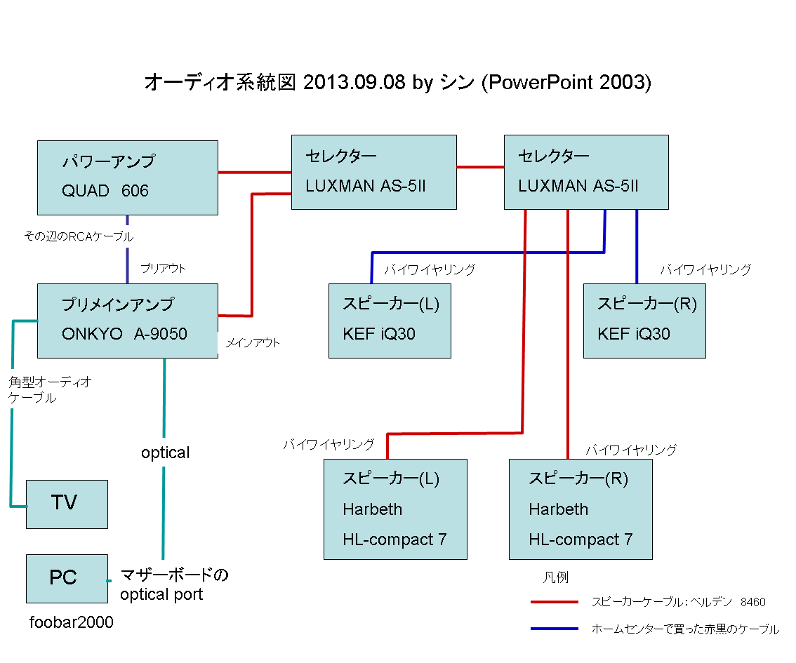 このシステムの最大のポイントは全部バイワイヤリング接続してるのでウーファー(低音部)とツイーター(高音部)を独立させて聞くことができるということですね。